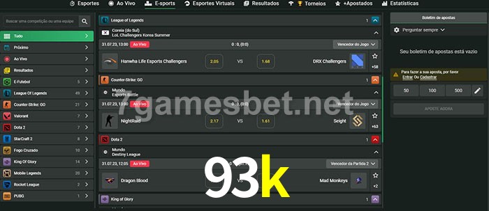 O 93k oferece uma grande seleção de opções de apostas em e-sports com probabilidades competitivas